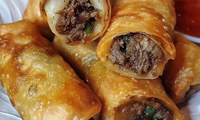 These savory egg rolls are a creative twist on a classic cheesesteak, featuring seasoned steak strips, caramelized onions and peppers, and provolone cheese, all wrapped in a crispy fried shell.