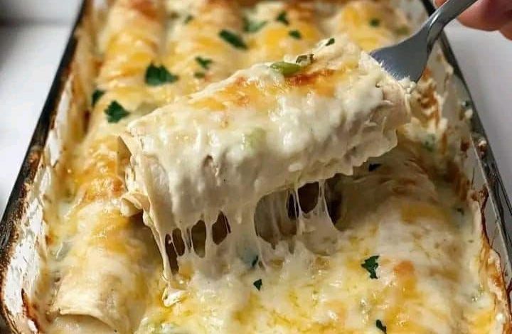 These White Chicken Enchiladas are a rich and creamy twist on the classic. Shredded chicken and green chilies are rolled in soft tortillas, smothered in a homemade sour cream white sauce, and baked until bubbly.