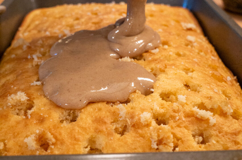 While the cake is still warm, slowly pour the mixture over the cake, letting it seep into the holes.