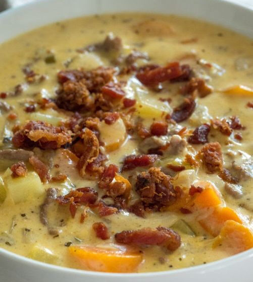 Serve hot with shredded cheddar and bacon bits on top. A perfect cozy bowl of comfort!