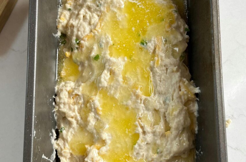 4. Pour batter into the prepared loaf pan and drizzle melted butter over top.