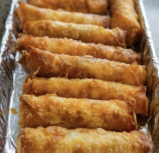 Heat oil in a deep skillet or heavy pot to 350°F (175°C). Fry 3–4 egg rolls at a time for 3–4 minutes each, turning occasionally, until golden brown and crispy. Drain on paper towels.