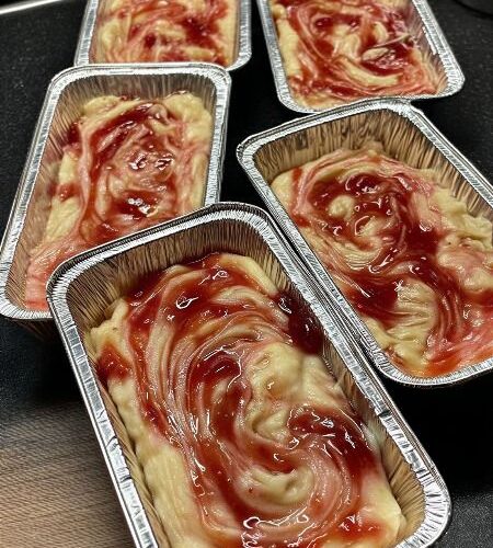 5. Divided batter between the prepared loaf pans then spoon jam on top. Use a knife to swirl jam into the batter.