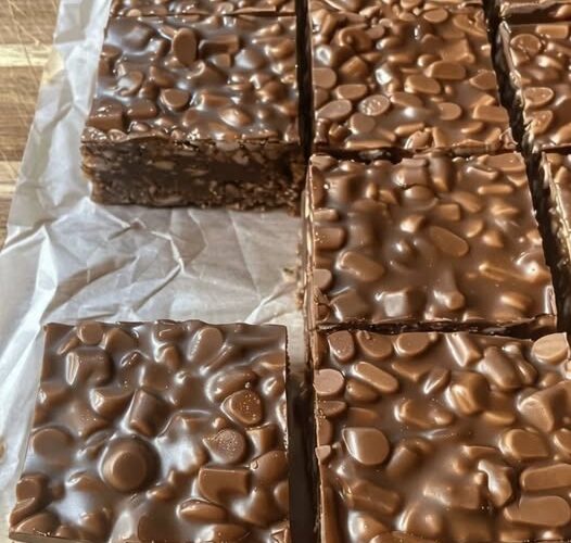 - Pour the chocolate/peanut butter mixture over the crispy rice cereal and mix until combined. Pour into the lined baking dish and refrigerate until firm (at least an hour).