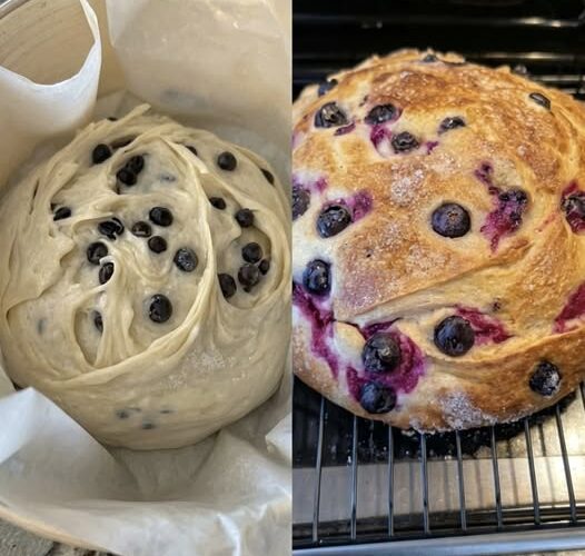 - Gently fold in blueberries and pour batter into prepared loaf pans. Bake until a toothpick inserted into the center comes out clean, 45-55 minutes.