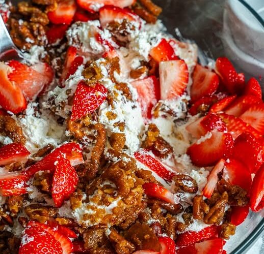 Timing is everything! Just before serving, fold the sliced strawberries and about three-quarters of the pretzel crackle into the cream mixture. Top with the remaining crunchy pieces for a beautiful finish.