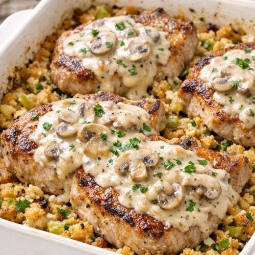 • For picky eaters: Use cream of chicken or cream of celery soup if your crew isn’t a fan of mushrooms. You can also cut the pork into bite-sized pieces before baking so little ones don’t have to tackle a whole chop.• Extra veggie boost: Stir 1–2 cups of frozen mixed vegetables (like peas, carrots, and corn) or frozen green beans into the stuffing before spreading it in the baking dish. It’s an easy way to sneak in more color and nutrition.• Apple & onion twist: For a slightly sweeter, fall-inspired version, sauté 1 small sliced onion and 1 chopped apple in a bit of butter until softened, then mix them into the stuffing before baking. This pairs especially well if you use pork stuffing or savory herb stuffing mix.• Cheesy topping: During the last 5–10 minutes of baking, sprinkle 1/2 to 1 cup of shredded cheddar or mozzarella cheese over the top. This makes the dish extra cozy and kid-friendly.• Different stuffing flavors: Try cornbread stuffing for a sweeter, Southern-style bake, or savory herb stuffing for more classic holiday flavors. Use whatever you have on hand in the pantry.• Make-ahead tip: Assemble the dish earlier in the day (through spreading the soup over the pork chops), cover, and refrigerate. When you’re ready to bake, add about 5–10 extra minutes to the covered baking time since it will be starting cold from the fridge.