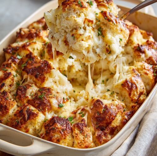 If you’re looking for a dish that disappears fast at any gathering, this Cheesy Pull-Apart Potluck Casserole is it. Warm, buttery biscuit pieces baked with gooey melted cheese and a hint of garlic—every bite is soft, golden, and irresistibly pull-apart.