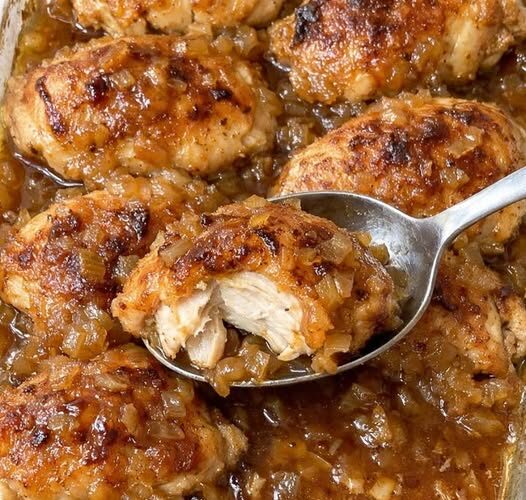 With just chicken, cream of chicken soup, and onion soup mix, this humble recipe transforms into something rich, comforting, and deeply flavorful. As it bakes, the chicken becomes tender and juicy while the onion soup glaze caramelizes into a golden, savory coating that fills the whole house with that unmistakable “home-cooked” smell.